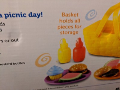 I LOVE this product and all the little touches that they put into it. The mustard and ketcup that "work". The colors used for this product are amazing. I would really suggest getting this for your kid that loves to play kitchen. My daughter loves to use it with her kitchen and make a picnic to "take with her". The quality for the "food" is awesome and is withstanding a two year old VERY well. I really suggest this product!