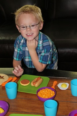 Kenzie enjoys setting up the plates/bowls and serving her toys and us. We have pretend sipping down! The "silverware" doesn't work with real food as Kenzie has tried using the fork to eat pasta without success. Kenzie's imagination is shown through the "meals" she cooks with her play pots/pans and serves with her new serving set from Learning Resources. The bright colors are fun for a toddler's senses and easy to keep the set organized. Kenzie has so much fun playing with this set as will your child.