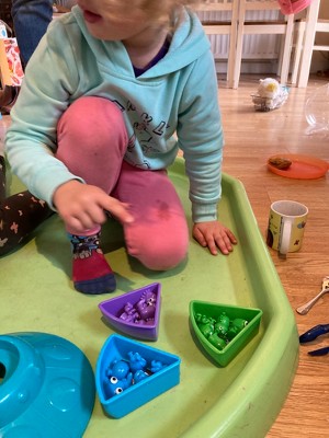 The Oodles of Aliens Sorting Saucer is fantastic for colour recognition, fine motor skills and pattern recognition.. The set is a sturdy plastic flying saucer, which, when you lift up the lid, contains 6 coloured trays in which to sort the funny looking aliens in. There is so many different ways you can play this game, using a variety of different skills to suit different age ranges. 'Find me all the alien's that have antenna'.. 'Find me all the red alien's.. ' 'You have one minute to sort the aliens into the right colour trays... go!.. ' The set comes with two Tri-grip tongs, to help with fine motor skills and a fun popping colour and number dice top that fits into the top of the saucer for more different game play! My 4 year old hasn't stopped playing with this.. and is definitely one of the best learning games I have found!.. If your thinking about getting this.. do it.. it's brilliant!