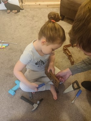 My daughters who are 2 and 5 both enjoy this set. They got to grips with it easily, no instructions are really needed. Their favourite part was drilling the pretend holes, although they did need some help from Daddy to hold so they could drill. Another bonus is the way it folds up into a neat carry case so this could easily be taken elsewhere such as relatives houses etc. It is easy to play with, my 2 year old is really into dress up so has loved wearing the belt! The only downside is there could be more variation, such as different size nails to hammer, and perhaps a few more parts in general.