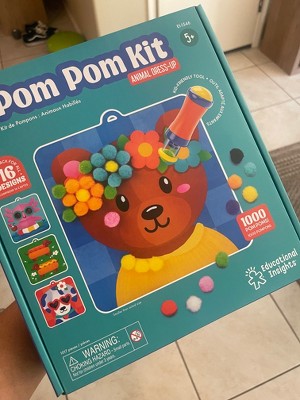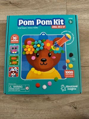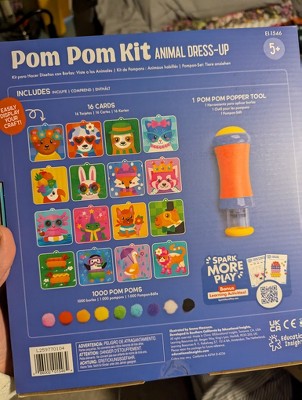 - INCLUDES – Kid-friendly pom pom popper tool, 16 animal dress-up design cards with loops at the top for easy hanging, and 1000 pom poms in vibrant colors