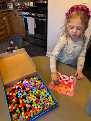 [This review was collected as part of a promotion.] I was so excited to received this product in exchange for a review. My five-year-old loved this pom-pom kit! She usually gets bored very quickly with crafting, but she was enthralled with this! She created five pictures in 45 minutes, which was unbelievable for her. We've been working hard on hand-eye coordination, so selecting pom poms, loading the device and inserting the poms correctly was great practice for her. We will be buying another kit as soon as she finishes this one!