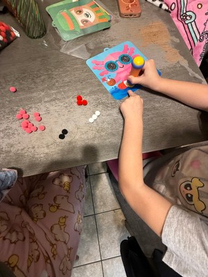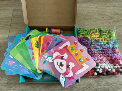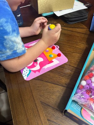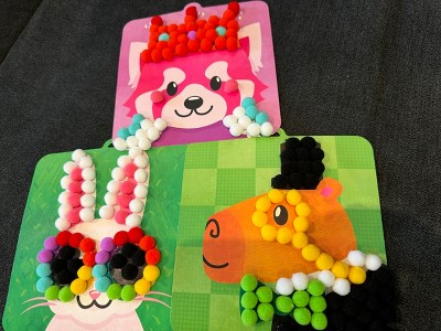 Kiss the mess and stress of other art projects goodbye! Pop on 3D designs in a mess-free, satisfying craft with the kid-friendly pom pom popper tool, perfect for kids ages 5+. Follow simple, step-by-step instructions to add 3D softness to animal dress-up design cards. This hands-on set develops fine motor, color matching & patterning skills, and encourages self-expression & independence. Once all the cards are decorated, use the loops at the top to hang them up right away! Includes pom pom popper tool, 16 design cards, and 1000 pom poms. No glue, no scissors, and no parental prep work required!