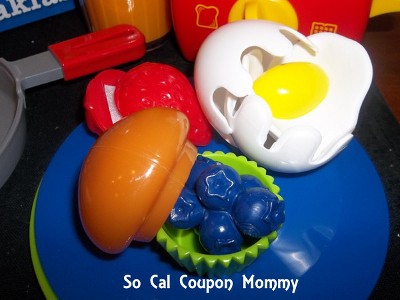 I have to say that I am a bit disappointed in this set. We have the Pretend and Play Healthy Lunch, Dinner, and Picnic sets, and this set falls short. The pieces are so much smaller and not at all as realistic as the other Learning Resources food sets we own. I was attracted to this set because I thought my son would really enjoy "cracking" the egg, but the egg barely fits into the egg and the egg is difficult to put together- even for me. I do think that Learning Resources makes some of the best plastic play food out there- I just wish I had went with one of the other two breakfast sets they offer; I would pass on this one.