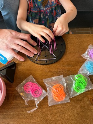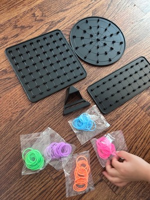 [This review was collected as part of a promotion.] I received this product for free in exchange for a review. I have a 5 year old that I tried this out on. The box comes with 3 different shapes, circle, square and rectangle and a stand to put it on. It also comes with several colors of neon glow in the dark rubber bands. My daughter particularly liked the pink and purple. The package comes with designs the kids can copy. I have a young 5 year old so some of them were too complicated for her. But it makes the product age appropriate for older kids. She enjoyed making different shapes with the rubber bands, seeing how many rubber bands can crisscross. It was a good activity for her and will continue to help teach basic geometry as she gets a little older and is able to copy some of the patterns.