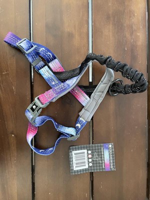 Leashboss No Pull Dog Harness with Bungee Handle, Rear, and Front Clip Attachment, Reflective Leader is an innovative dog harness with bungee clip that absorbs shock from strong pullers. This no-pull harness provides extra security for escape artists and extra attachment points for comfortable on-leash walking and training. If your dog pulls on their lead while wearing a traditional collar, you will be familiar with the sound of them straining and choking. Switch to a harness designed to take the strain off their neck during walks, and still ensure a secure fit. Leashboss' no pull dog harness has a rear attachment clip at the dogs shoulders and features a strong and durable bungee design. This is a great option for play time and long leash training. Throwing a frisbee or playing fetch on-leash is safer with the shock absorbing bungee attachment point. The reflective bright design adds safety and style for your pup. The polyester adjustable dog walking harness has fun patterns and matching quick release buckles. A soft neoprene fabric on the interior ensures a comfortable fit for your pet. Reflective threads ensure extra safety and visibility for nighttime walks. This no pull dog harness has two attachment points for easy walking, no more pulling and choking. Comfortable as it is durable, it has a strong front attachment at the chest to provide more control, and a second attachment at the shoulders for traditional use. Available in multiple sizes to fit most dogs. Measure your dogs chest and girth to ensure a comfortable fit. Use our size chart in the photos to find the right size for your pet. SIZING CHART - SMALL (Chest Girth 18.5 - 24", Neck Girth 15.5 - 17.5"), MEDIUM (Chest Girth 21.5 - 28", Neck Girth 16.5 - 19.5"), LARGE (Chest Girth 25.5 - 33", Neck Girth 17.5 - 21"), EXTRA LARGE (Chest Girth 28.5 - 36", Neck Girth 18.5 - 22.5"). Please note small harness straps are 3/4" wide.