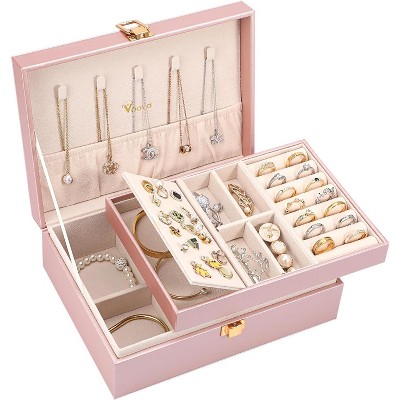 Leather Jewelry Box with Clear Lid, 2-Drawer Storage Organizer Case for Necklaces, Rings, Earrings, Bracelets Pink-White 2 Layer
