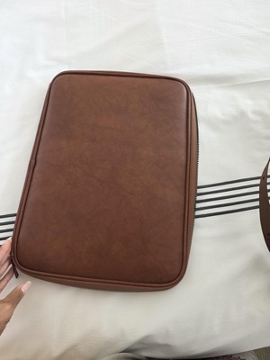 This is a really cute and functional laptop case! I have to admit that I initially grabbed this because it was aesthetically pleasing. I love the look of the leather-like material, it's a great caramel brown color. It's soft and supple and felt great in my hands. It protects my equipment without being bulky or hard to handle. The zipper is solid and feels like it will hold up to extensive use, which is great because I can't count how many times I put my laptop to bed only to remember the one thing I forgot to do smh. I love the interior pockets, the cord organizer is great and kept my charger and phone charger secure but easily accessible. This is a great pickup for anyone looking to keep their equipment secure and look good while doing it.