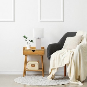A really nice lamp for around $20.00. Arrived sooner than expected. Nice modern, sleek look. Deducted a star because shade is wobbly and push thru switch is a bit of a pain. But for the money it's a really nice lamp.