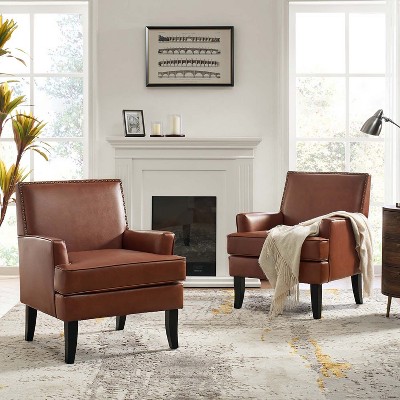- Smooth, supple faux leather in a neutral hue adds a sleek, modern touch to any room. Track arms create a clean, contemporary silhouette that complements modern living spaces. Tapered feet not only provide sturdy support but also enhance the chair's overall stylish appeal. Webbed decking and an attached cushion offer a perfect balance of softness and support for optimal comfort. The neutral color and timeless design make this chair a perfect addition to any living room, den, or office.