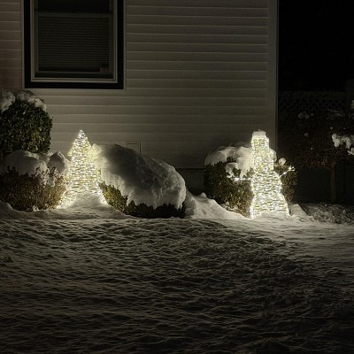 A: The tree sculpture features an open-wire tiered-triangle design in a champagne hue.