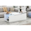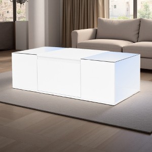 - This coffee table combines modern elegance with intelligent features. The transparent glass tabletop enhances openness, while hidden drawers and open storage compartments provide flexible, multi-directional organization. Spacious tabletop accommodates daily items, seamlessly merging practicality with style. Built-in 16-color LED light strip allows easy adjustment via Bluetooth app. Sturdy base ensures stable support for heavy objects. Minimalist design fits various d¨¦cor styles, making it an ideal centerpiece for any living room.