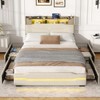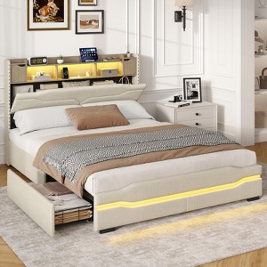 LED Platform Bed Frame with Storage Headboard, 4 Storage Drawers & Charging Station, Metal Support Base