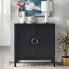 Complement your dining or living room with the Leelah Console Cabinet by Lifestorey. The perfect accent piece in a transitional design that works well with nearly any interior. Featuring stunning circular metal door handles with a brass tone finish that captures your attention as soon as you enter the room. Behind the two doors is an adjustable shelf for storing dishware, serving pieces, barware, and more offering convenient storage wherever it is placed. Crafted of MDF with solid wood legs in a rich black finish.
