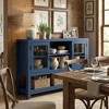Left and right hidden doors, middle shelf storage cabinets with embossed blue patterns
