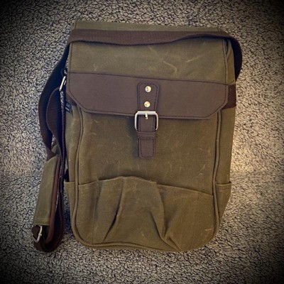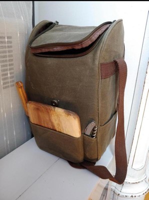 [This review was collected as part of a promotion.] This Distressed waxed canvas wine bag is very well made. The seems are sturdy and it easily carries two bottles of wine. It comes with a very nice wooden cutting board, a cheese knife and a corkscrew. The straps are easily adjustable making it a comfortable fit to wear over my shoulders. This was a great addition to our last picnic outing! It would make a great gift too.