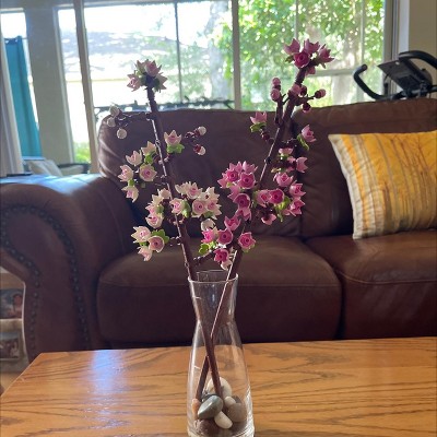 A: Each cherry blossom twig measures over 14 in. (35 cm) long. Vase size could vary on your preference to having the stems stand straight or lean against the top of the vase. - Jane, LEGO® Customer Service