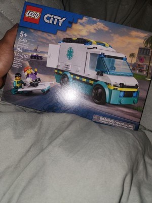 Step into the action and complete rescue missions with the LEGO City Emergency Ambulance (60451) building toy for kids ages 5 and up. The toy ambulance features side panels that fold up, rear doors that open for easy access to the onboard stretcher and medical equipment, including a toy syringe, bandage and medic bag. The playset also includes a skateboard and skate ramp setting, plus skateboarder and paramedic minifigures for fun role play and storytelling possibilities. This car toy building set includes a step-by-step printed construction guide. Kids can also use the 3D instructions in the LEGO Builder app to explore and save playsets, track their own building progress, and zoom and rotate to view models from all angles. LEGO City Great Vehicles playsets feature land, air and water toys for imaginative play without limits. Kids can add this emergency vehicle toy to other sets (sold separately) from the LEGO City range for even bigger adventures! Contains 184 pieces.