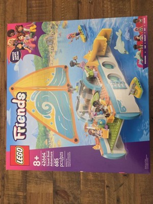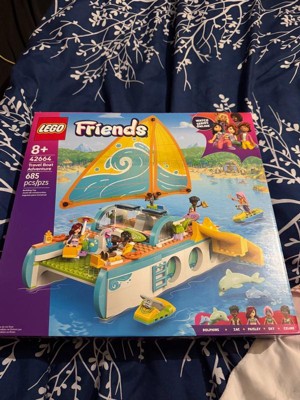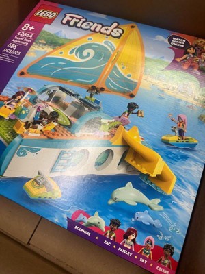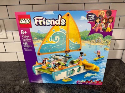 Set sail for fun with the LEGO Friends Travel Boat Adventure (42664)! Young sailors ages 8 and up can build their dream vacation vessel and cruise the waves with Paisley, Zac, Celine, and Sky. This awesome boat toy brings vacation dreams to life with its working sail that moves when kids turn the steering wheel! The adventure begins as friends spot adorable dolphins with binoculars, zoom across the water on speedy water scooters, catch thrills on the cool surfboard, or relax in the built-in hot tub with its colorful floatie. When it's time for a snack, kids can pop off the top deck to reveal the surprise dining hideaway where friends whip up delicious vacation treats in the secret kitchen. After a day of ocean exploration, everyone heads to the cozy sleeping quarters with four beds for rest and more adventure planning. With so many pretend play ocean features—from the fun gaming station to the fully equipped bathroom with shower—every day brings new seaside stories! Perfect as a birthday gift for girls and boys who love boat toys, travel adventures, and creating fun stories with friends. The LEGO Builder app offers helpful 3D instructions for smooth sailing during construction. Contains 685 pieces.