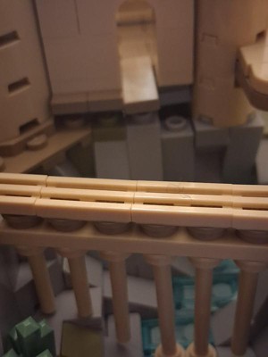 The tallest castle on the left is not holding on no matter hiw much pressure you put in and if u try it the little building in the back of the bridge will go down. Some parts are not even covering and you can see holes. Some parts don't want to attach.the bridge is horrible has no support and if one piece falls in you would need to take the whole yhings down. It has no support and is poorly designed. The left building in the way end has no support except one part holding it, it moves all the time. The top of that building is horrible and never stays on.