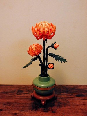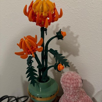 My wife purchased this lovely chrysanthemum for me as an early Christmas present. I previously purchased the large white blossomed orchid and the plum blossom. Both of those are amazing kits, but the chrysanthemum is by far my favorite in almost every category. The colors are wonderful. The beautiful sage and gold of the vase juxtaposed with the dark green of the foliage and stem crowned with the fiery yellows and oranges produces in my opinion the best of the four gentlemen produced by Lego. I would love to see a larger rendition. Excellent build. I prefer this vase Style in contrast to the plum blossom. Highly recommended!