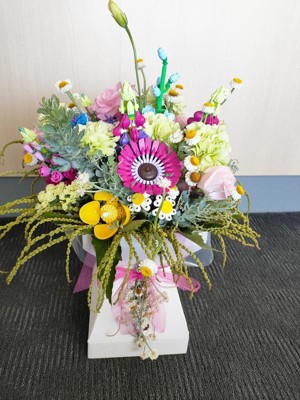 - Tailor and Adjust – Set features 16 stems with a mix of flowers: cornflower, lavender, Welsh poppies, cow parsley, leatherleaf ferns, gerbera daisies, larkspur and lupins
