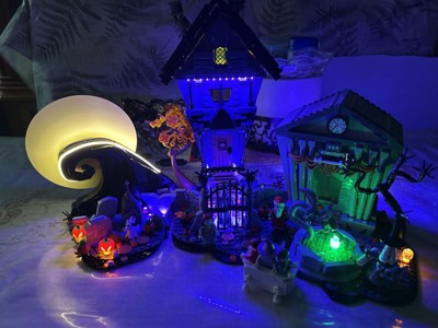 - RECREATE THE NIGHTMARE BEFORE CHRISTMAS MOVIE SCENES – Connectible models of Spiral Hill and the graveyard, Jack Skellington’s house and the Halloween Town Hall with a fountain outside