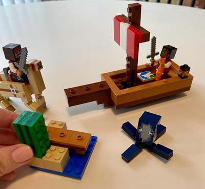 - Minecraft playset with a boat toy – This pirate ship toy is a buildable vehicle playset featuring a squid, camel, 2 pirate minifigures (a Swashbuckler and a Buccaneer), plus accessories
