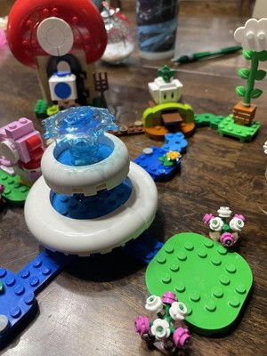 - Kids discover a Super Star Block in the chimney 'smoke' of Blue Toad house, knock the top off the fountain to reveal a Coin Block and get rewards