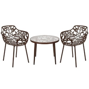 Product Name: LeisureMod Devon Mid-Century Modern 3-Piece Aluminum Outdoor Patio Dining Set with Tempered Glass Top Table and 2 Stackable Flower Design Arm Chairs in Brown