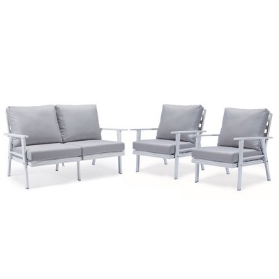 LeisureMod Walbrooke 4-Piece Outdoor Patio Conversation Set – Grey Trim Fire Pit Table with Cushioned Ottoman for Patio, Deck, Balcony & Backyard