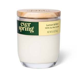 Get the fresh, crisp, clean scent of fragrant lemons along with the refreshing, cool notes from mint in the Lemon and Mint 100% Soy Wax Candle from Everspring. This candle is perfect in any space that needs a deodorizing, fragrance lift: the kitchen, bathroom, laundry or even an entryway to give a fresh, front-door welcome. This 5.5 oz. clean-burning candle is made with 100% natural essential oils and dye-free, plant-based soy wax for the utmost in good-for-you, natural air care. Poured in an attractive, thick, glass container with wooden lid, the candle complements any decor, any time of the year.