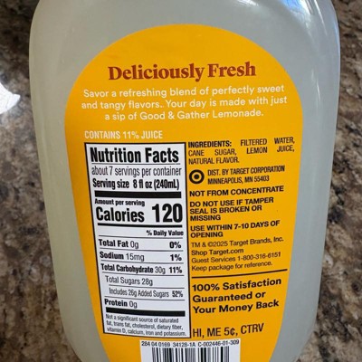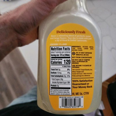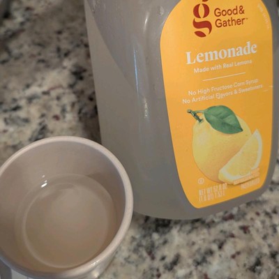 Enjoy a refreshing sip of summer anytime with this Lemonade from Good & Gather™. Made with real lemons, this lemonade is not from concentrate and has no artificial flavors or sweeteners added. Great for enjoying alone or mixing into cocktails or mocktails, it comes in a 52-fluid-ounce size that's perfect for sharing.