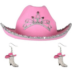 Comes with a set of 2 pink cowboy hat/boot earrings. Earrings are included in a small polybag inside the package.