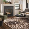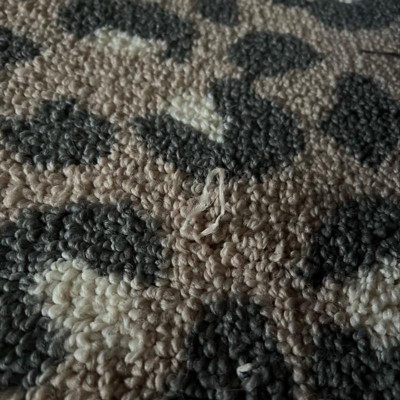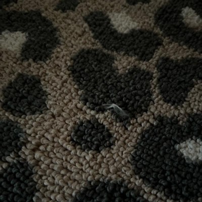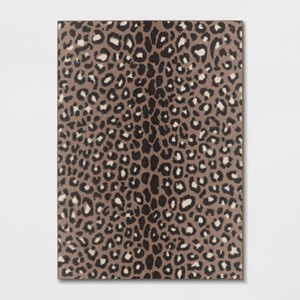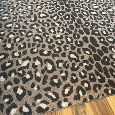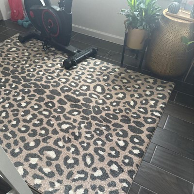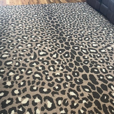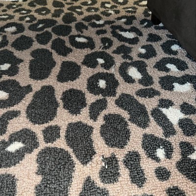 A: The rug features a leopard pattern in brown, cream, and beige hues.