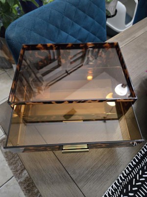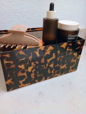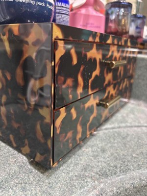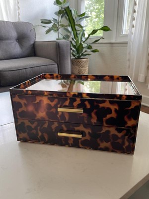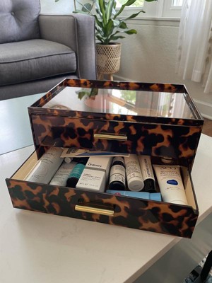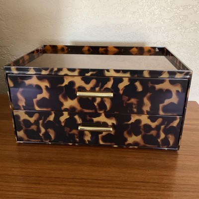 Organize your vanity or any other space in trendy style with the Stacking Drawers from Threshold™. This pack of two drawers is made of acrylic and covered with leopard print for an attractive look you'll love while helping maintain a clean and organized space. Plus, they come with an extended gold-tone handle for easy opening.