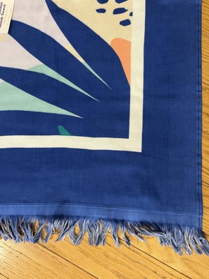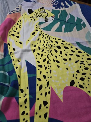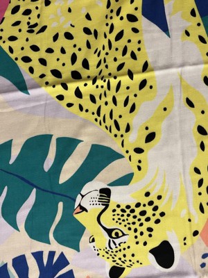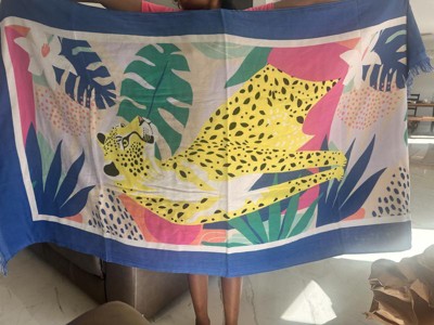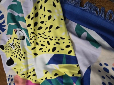 Get ready to have fun in the sun and sand with this Leopard XL Sand-Resist Beach Towel from Sun Squad™. Made of 100% cotton, this extra-lightweight beach towel has an oversized rectangular silhouette that's perfect for sunbathing on the beach or drying off at the pool. It’s adorned with a yellow leopard on a tropical backdrop in blue, green, white, peach and pink hues and accented with fringed ends for summery style.