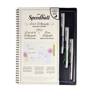 The Lettershop Calligraphy Project Set by Speedball introduces fine writing skills to help you address envelopes, invitations, and certificates with a classic and formal style. This set not only teaches calligraphic letter formation but also inspires project ideas such as greeting card designs and personalized thank you notes. The Lettershop Calligraphy Project Set contains 3 Elegant Writer Calligraphy Markers: 1 fine tip with black ink, 1 extra-fine tip with teal ink, and 1 broad tip with red ink. This 62-paged spiral bound book features complete instructions for beginners, practice pages, and removable guide liners to keep your writing neat and aligned. The book also includes a reusable tray for convenient pen storage and portability.