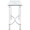 Transform your living space with the Letty acrylic console table in silver. This exquisite piece blends modern design with elegant functionality. Crafted with sleek acrylic, sturdy stainless steel, and a clear glass top, the Letty table adds a touch of sophistication to any room. Its silver color enhances its contemporary look, making it a versatile addition to different decor styles. With its clean lines and minimalist appeal, this console table is not just a functional piece but also a statement of style. Whether placed in an entryway, hallway, or living room, the Letty table offers both beauty and practicality for your home. Experience simplicity and elegance woven into one stunning piece.