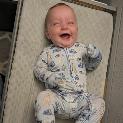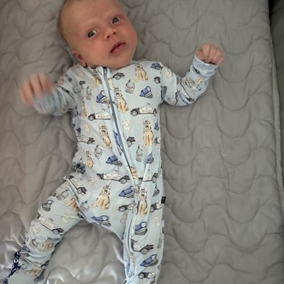 [This review was collected as part of a promotion.] These pajamas are super soft and stretchy! The police print is very unique and is a beautiful design on a very soft blue background. The feet have little grippers on them and the double zipper is my favorite feature! Perfect for middle of the night diaper changes. Runs true to size- my child typically wears 3-6 months and this 3-6 month size fits perfectly with room to stretch and grow still. I received an incentive to write this review.