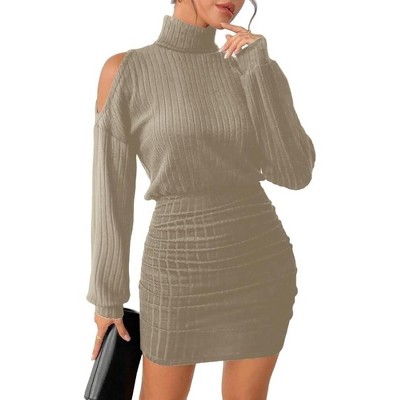 - Design: A must-have basic sexy turtleneck mini sweater dress featuring ribbed knit,drop shoulder,lantern long sleeves,cold shoulder,above-knee length, ruched design on both sides, and an elastic band at the waist that accentuates the slimming effect on the lower half. It hugs your body perfectly to show your femininity.
