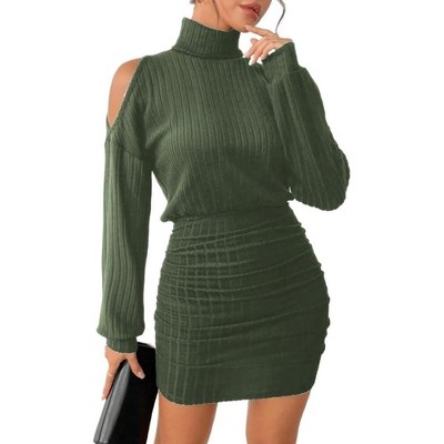 - Design: A must-have basic sexy turtleneck mini sweater dress featuring ribbed knit,drop shoulder,lantern long sleeves,cold shoulder,above-knee length, ruched design on both sides, and an elastic band at the waist that accentuates the slimming effect on the lower half. It hugs your body perfectly to show your femininity.