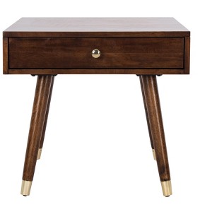 This Levinson End Table is a fabulous fusion of Mid Century style and contemporary chic. Awakening the aesthetic of any interior, Levinsons brass caps and hardware shine against a dark brown wood frame, making it ideal for a myriad of design styles.