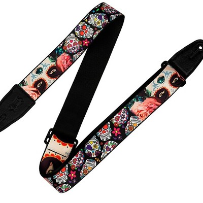 A handcrafted guitar strap built from durable polyester with a Mariachi print.