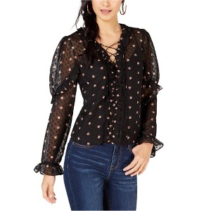 Leyden Womens Floral Print Lace-Up Sheer Pullover Blouse