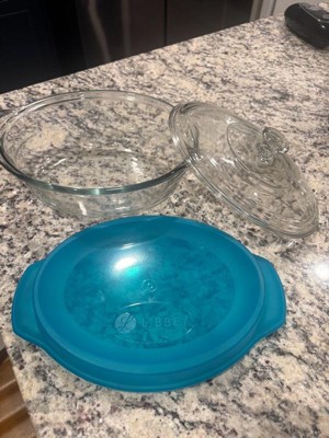 - Includes one 2-quart oval clear glass casserole dish with a fitted glass lid for baking and a plastic lid for storage.