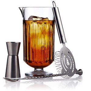 - Includes 25.5-ounce stirring glass (4.1-inch diameter by 7.5-inch height), stainless steel strainer, satin finish jigger (1.7-inch diameter by 3.35-inch height) and mirror-finish long stirring spoon