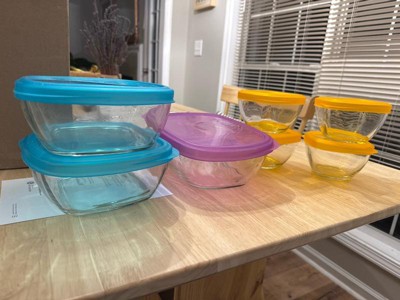 The Libbey Serve It 14-Piece Glass Storage Container Set includes four 2-cup bowls with yellow lids, two 6-cup bowls with blue lids, and one 8-cup bowl with a purple lid, giving you a variety of sizes for snacks, leftovers, or meal prep. Designed to be multifunctional, Serve It allows you to prep, bake, serve, store, reheat, and serve again in the same dish—minimizing the number of dishes you need and helping you cheat cleanup. Each container is made from durable glass that is safe for the microwave, oven, freezer, and dishwasher, with the caution not to move directly from freezer to oven. The colorful lids provide a secure fit to keep food fresh, while the stackable design keeps your storage organized and efficient.