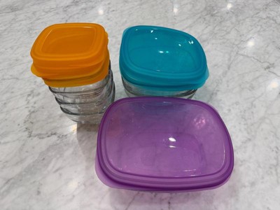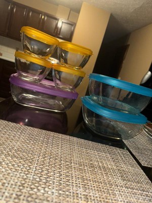 - Includes four 2-cup bowls with yellow lids, two 6-cup bowls with blue lids, and one 8-cup bowl with a purple lid.