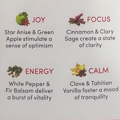 energy pure essential oils (fir balsam, black pepper), natural fragrance (white pepper, berry, vanilla) calm pure essential oil (orange), natural fragrance (clove, tahitian vanilla, carnation) focus pure essential oils (clary sage, vetiver), natural fragrance (clove, gardenia, cinnamon) joy pure essential oil (fir balsam), natural fragrance (star anise, green apple, musk)' '